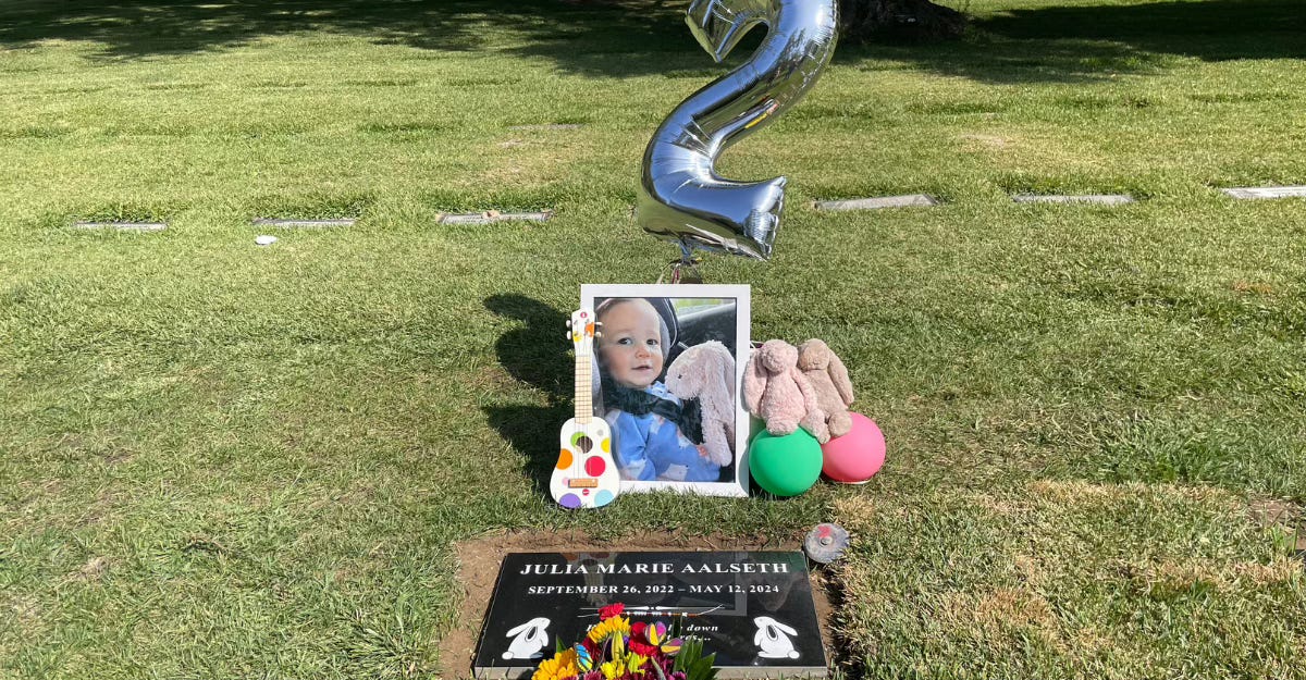 There's no manual for this. I'm not sure I would know how to throw an earthly birthday for a two-year-old, let alone a heavenly one. But as a parent, you do these things, because that's how you know how to love. I intend to be Julia's mom forever. I promised her when she died that I would hold her forever. I'm doing my best, Jules.