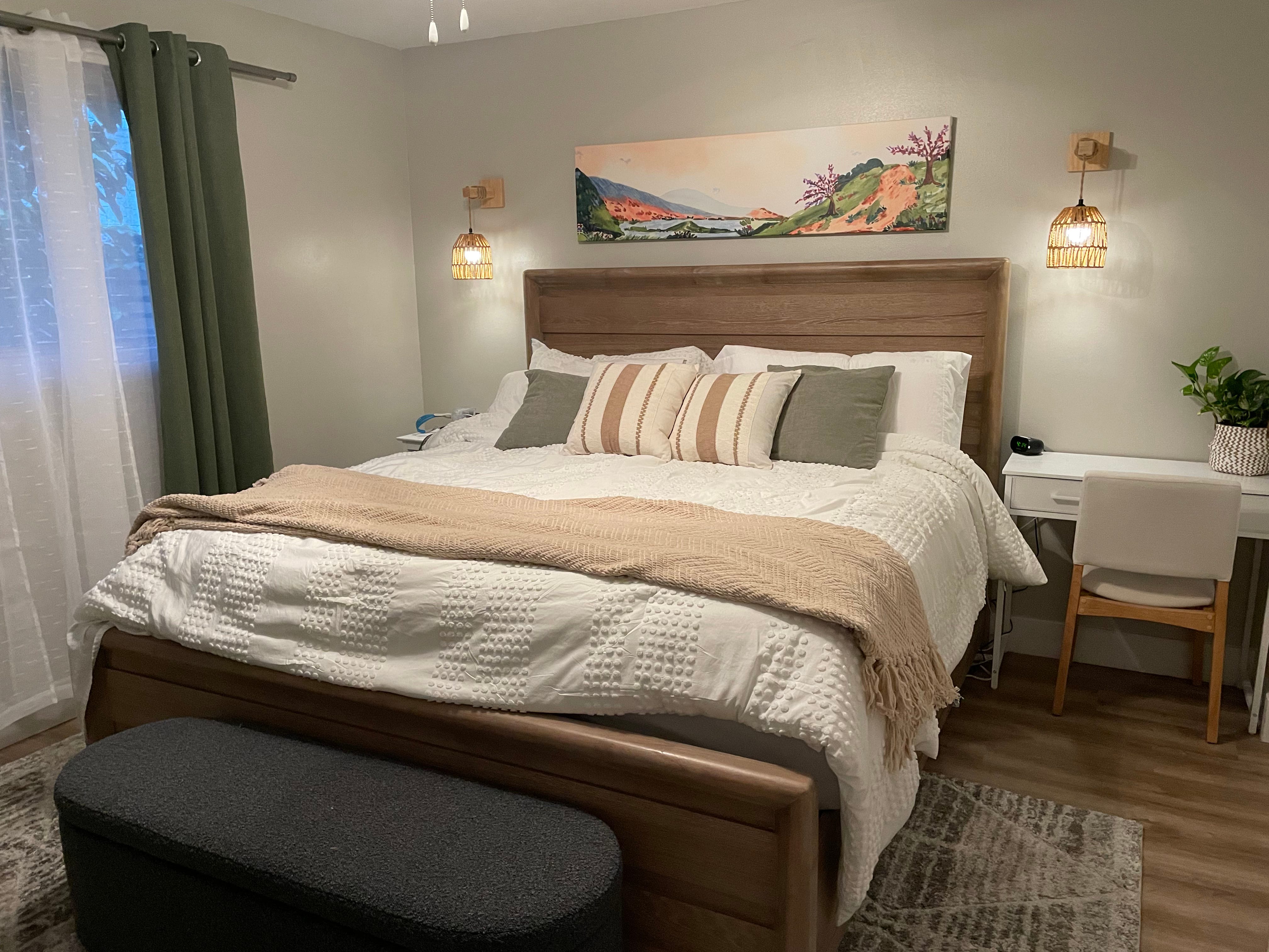 I spent the last couple months putting my home back together after a pipe burst and the ceiling above our bed collapsed. I’m not an interior designer but I know when something feels off. I’ve spent weeks deliberating on the colors of curtains and pillows because it just didn’t feel peaceful to me yet. I’ve learned about the importance of plants and lighting and warm colors. With the help of some great friends and family, the place finally feels like home. I breathe better and deeper when I walk into my bedroom now. Here’s a before, middle and after picture (you can see how bad my first attempt at decorating was!)